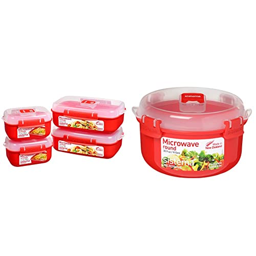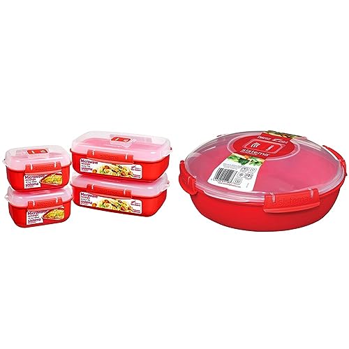 Sistema Microwave Heat and Eat 3 Pack, Red/Clear, Pack of 3 & Round Microwave Dish, Red, 1.3 L