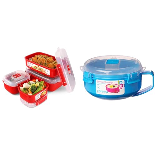 Sistema Rectangle Microwave Container | 1.25 L | BPA-Free | Red/Clear & Microwave Breakfast Bowl | Round Microwave Container with Lid | 850 ml | BPA-Free | Assorted Colours | 1 Count