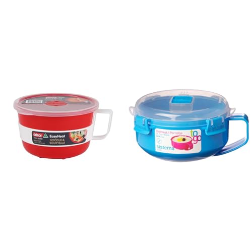 Décor Microsafe EasyHeat Bowl | Microwave Bowl Perfect for Noodles & Soup | 1.15L Capacity - Red and Sistema Microwave Round Bowl - Microwave Food Container - 915 ml - BPA-Free - Red/Clear
