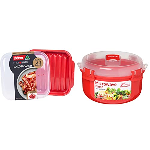 Décor Microwave Bacon Cooker | Splatter Proof Crisper Tray with Lid | Dishwasher Safe | BPA-Free & Sistema Microwave Round Bowl - Microwave Food Container - 915 ml - BPA-Free - Red/Clear