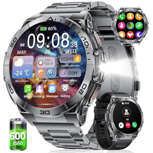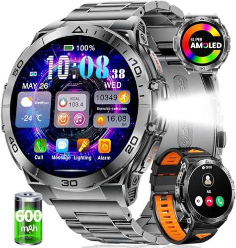 HIRREO Smart Watch Men Bluetooth Answer Make Calls 600 mAh Big Battery 1.6" HD AMOLED Round Male Smartwatch for iOS Android Black Steel Flashlight,Heart Rate/Sleep/SpO2 Monitor,100+ Sports Mode