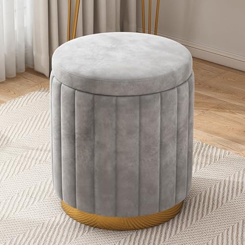 MEILISHAOMEI Round Velvet Storage Ottoman,Upholstered Soft Foot Rest Stool With Gold Base,Large Capacity Vanity Stool Chair For Living Room Bedroom-Grey 34x34x45cm(13x13x18inch)