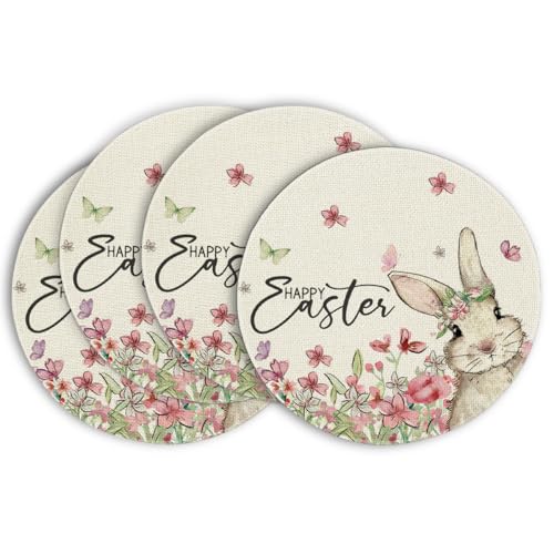 HQHYGM Artoid Mode Easter Round Placemats Set of 4, 14 Inch Bunny Flowers Spring Round Table Mats for Easter Party Dining Decoration