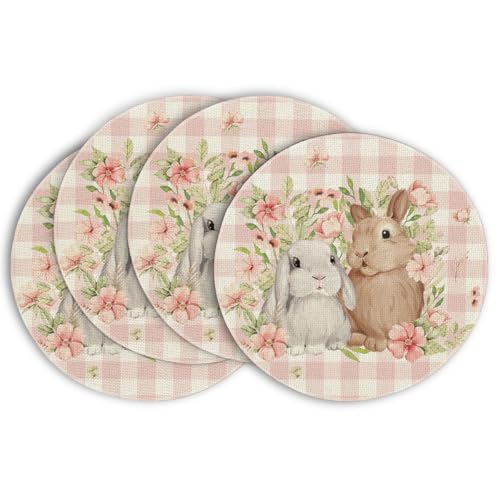 HQHYGM Artoid Mode Easter Round Placemats Set of 4, 14 Inch Buffalo Plaid Bunnys Flowers Spring Round Table Mats for Easter Party Dining Decoration