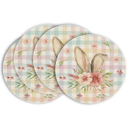 HQHYGM Artoid Mode Easter Round Placemats Set of 4, 14 Inch Colored Buffalo Plaid Rabbit Ears Flowers Spring Round Table Mats for Easter Party Dining Decoration
