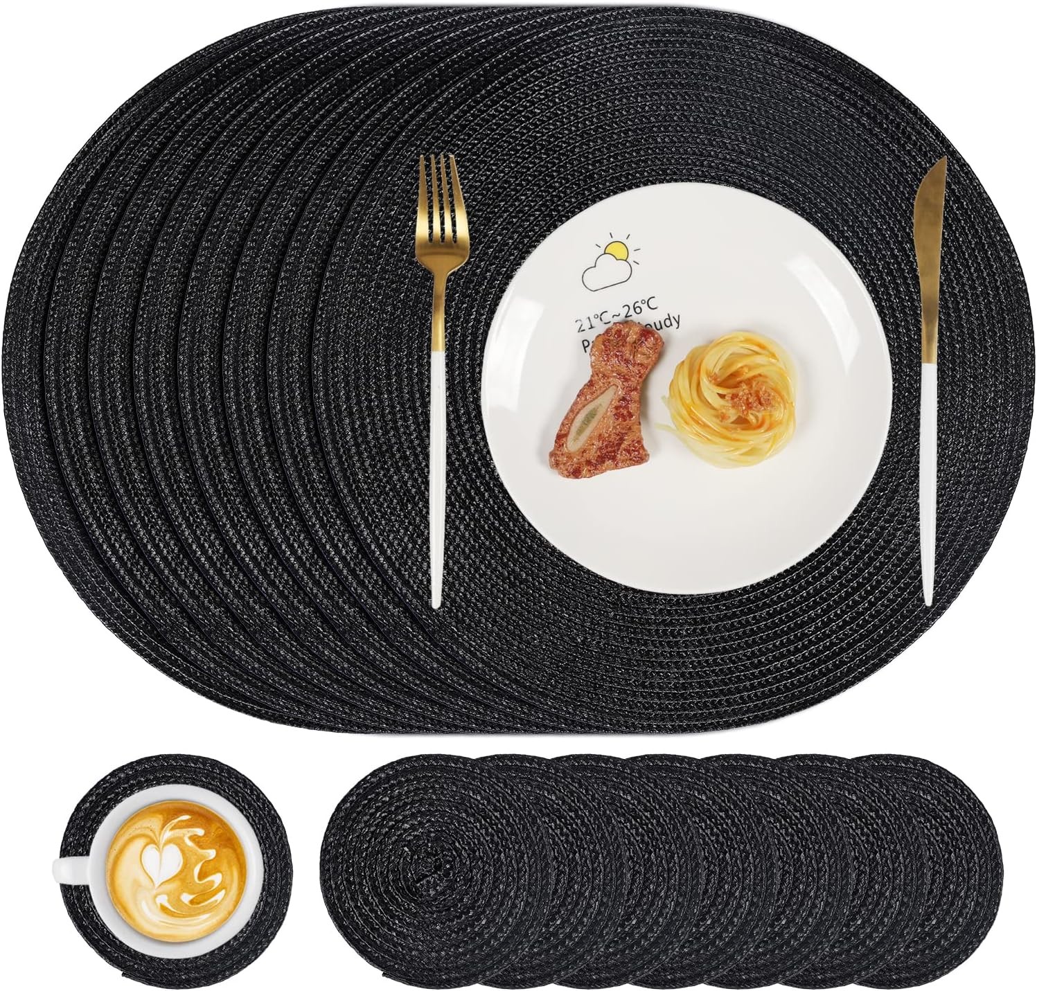 Famibay Placemats and Coaster Sets 8 Round Woven Table Mats Heat Resistant Blac