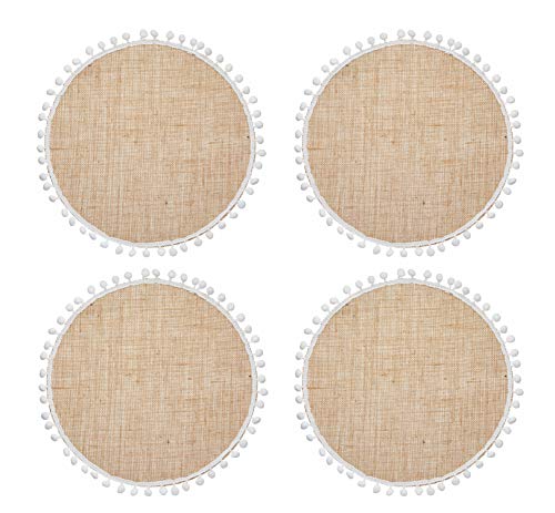 KitchenCraft Natural Elements Hessian Placemats, Set of 4 Woven Jute Round Table Mats with Pom Pom Decorations, 38cm
