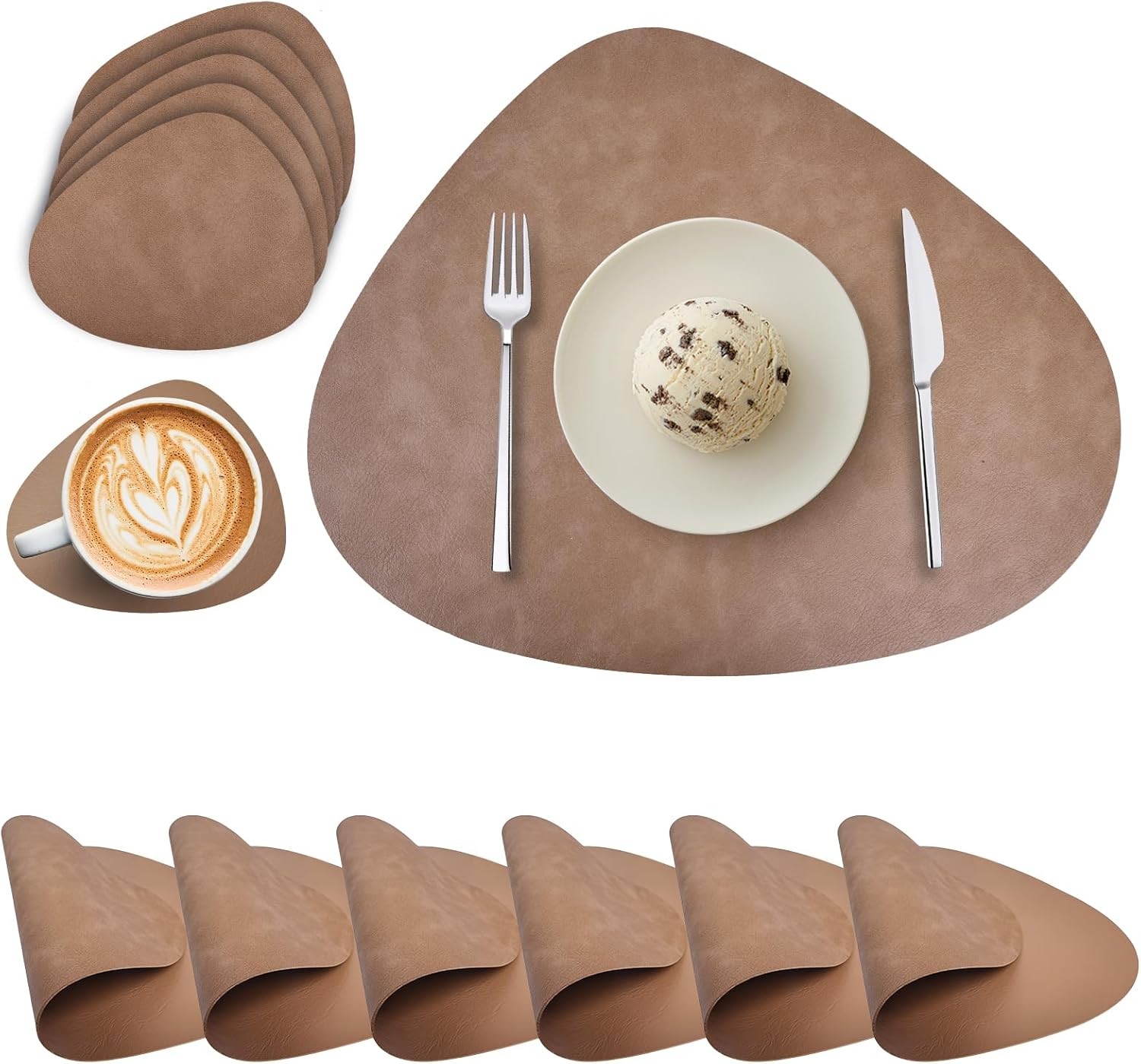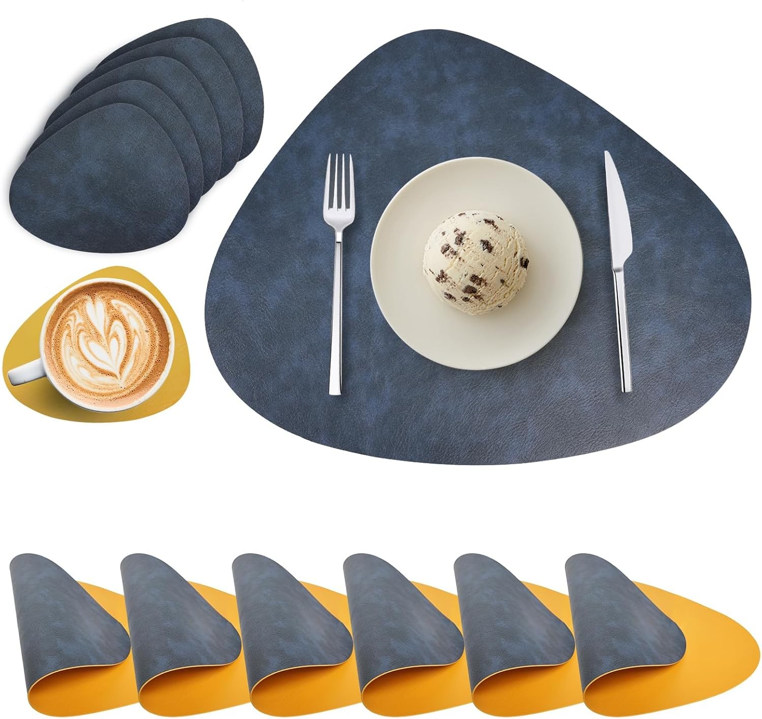 Placemats and Coasters Sets of 6, PU Leather Round Table Mats Heat-Resistant Wa