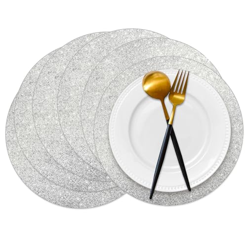 50 Pieces Silver Glitter Paper Place Mats Sparkle 14'' Round Disposable Table Mats Silver Sequin Doilies Decorative Placemats for Wedding Banquet Party Home Dining Tableware