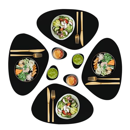 CaSail Faux Leather Placemats and Coasters - Set of 4 Round Modern Black Table Mats for Dining - Heat Resistant, Waterproof & Non Slip Place mat for Indoor & Outdoor - Wipeable for Easy Care