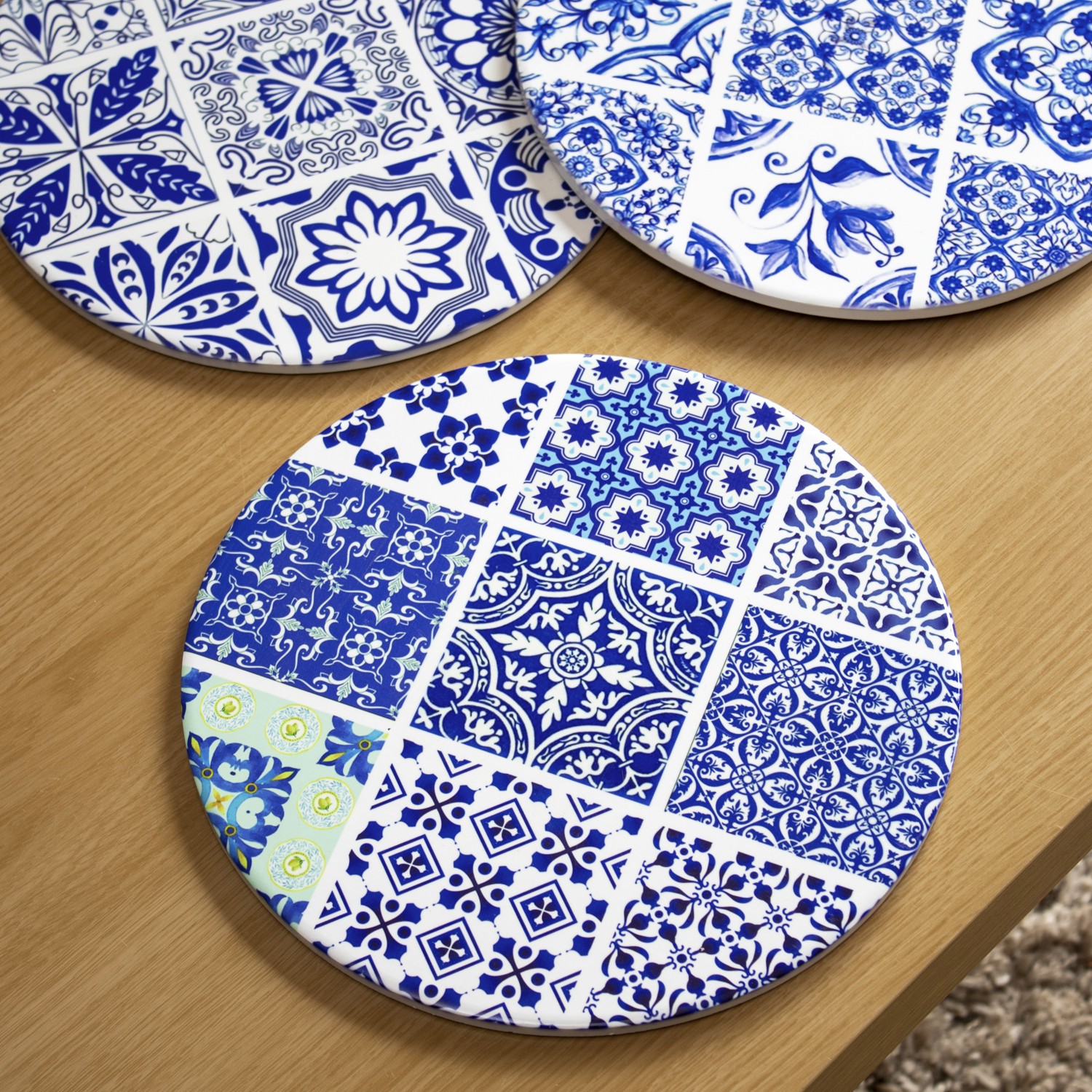 Set Of 6 Blue White Mediterranean Tile Placemats Round Ceramic Cork Table Mats