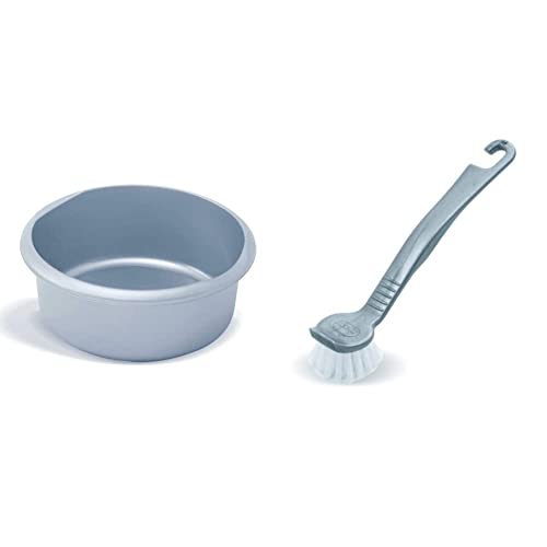 Addis 518458 Eco Made from 100% Plastic Round Washing Up Bowl, 7.7 Litre, Recycled Light Grey, 34 x 34 x 13cm & 510290 Round Pot Dish Brush, Metallic, 5 x 4 x 21 cm