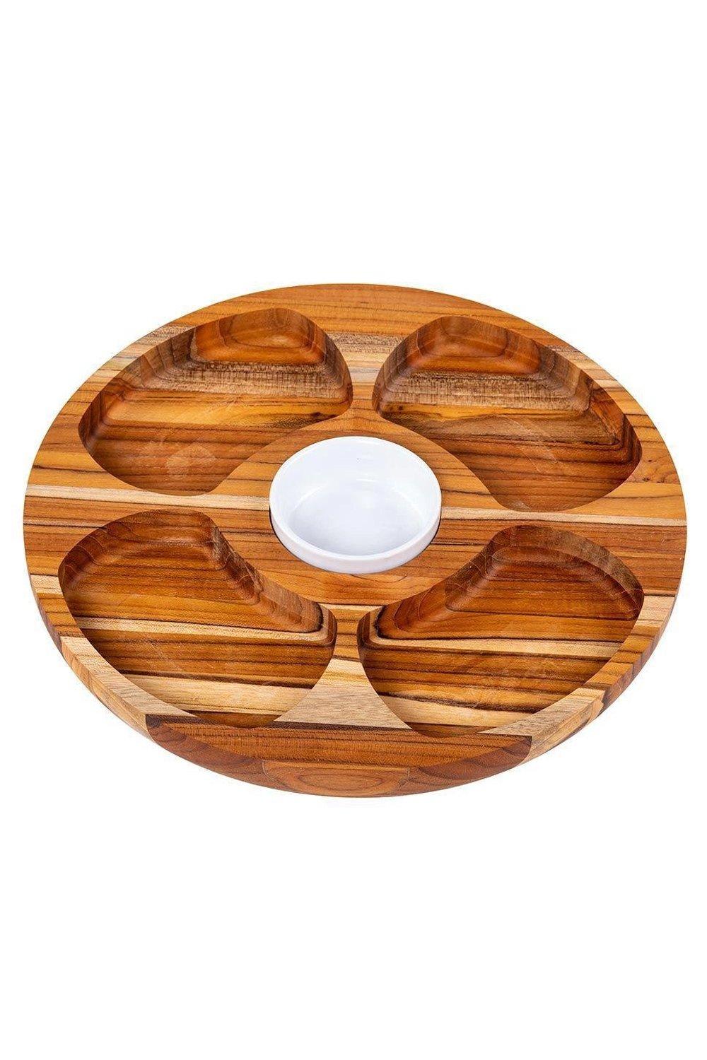 Round Teak Wood Snack Serving Board 5 Divisions with Porcelain Bowl 35.5 x 2.4cm