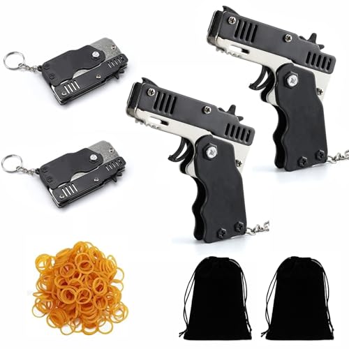 2 Packs of Mini Metal Folding Rubber Band Gun Toy with Keychain and Over 100 Rubber Bands.