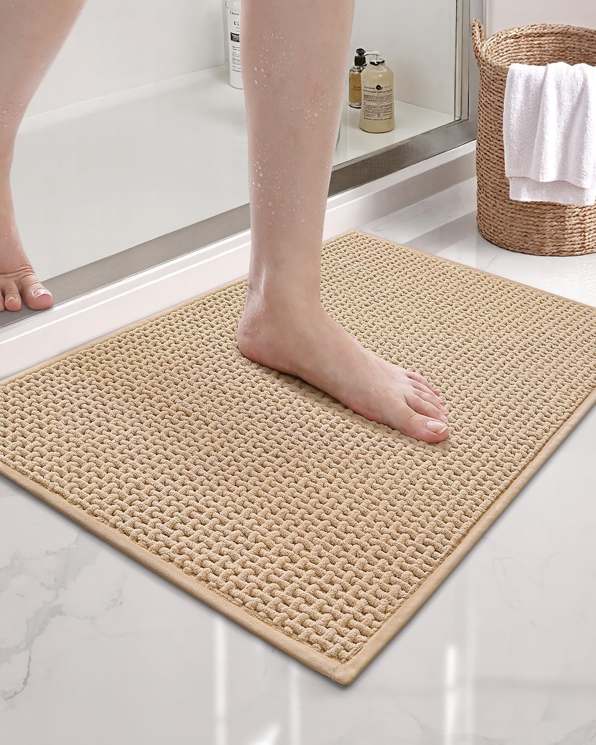 COLOR&GEOMETRY Chenille Rubber Backed Beige Bath Mat- Non Slip, Absorbent, Quic
