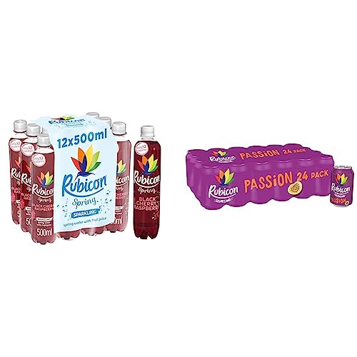 Rubicon Spring, Sparkling Spring Water with Real Fruit Juice & Natural Flavours, 500ml Multipack Bottles, 12 Pack & Sparkling Fizzy Drink with Real Fruit Juice 330 ml Multipack Cans, Passion, 24 Pack