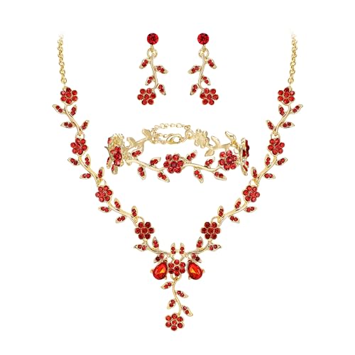 Clearine Women's Wedding Jewellery Set for Party Prom Leaf Cluster Flower Crystal Pendant Necklace Dangle Earrings Link Bracelet for Bridal Brides Bridesmaid Ruby Gold-Tone