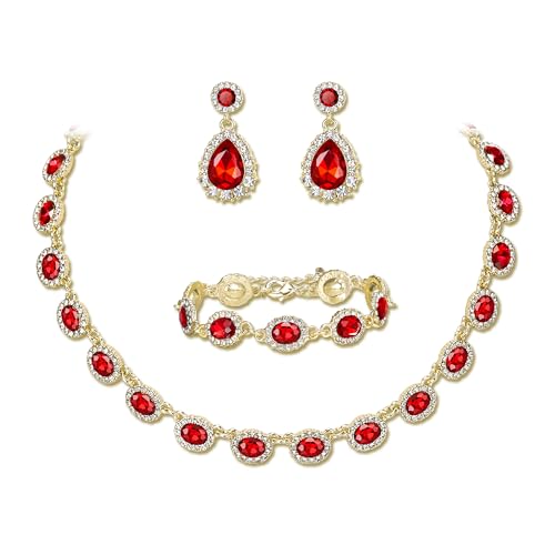 Clearine Weddding Costume Jewellery Set for Women Bridal Bridesmaids, Oval Crystal Collar Statement Necklace Teardrop Pierced Dangle Earrings Link Bracelet for Prom Party Ruby Gold-Tone