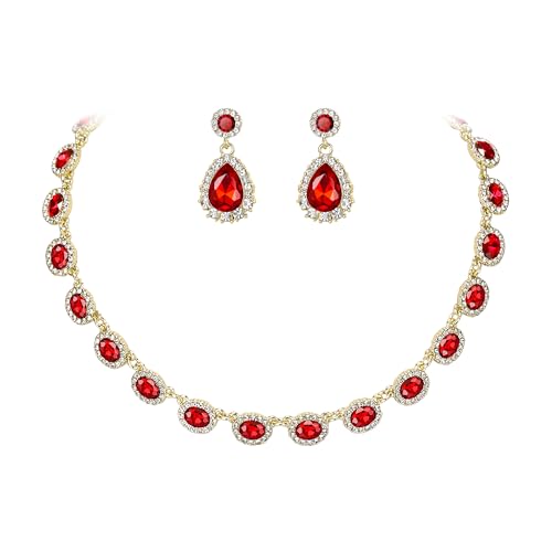 Clearine Prom Costume Jewellery, Oval Crystal Collar Statement Necklace Teardrop Pierced Dangle Earrings Weddding Jewellery Set for Women Bridal Bridesmaids Ruby Gold-Tone