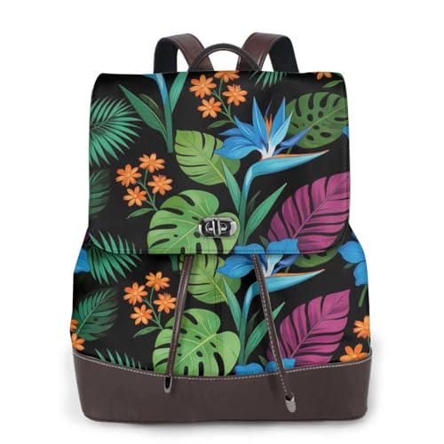 Zelinge Fashion Leather Backpack Purse For Women Fashion Shoulder Bag Pu Leather Rucksack, Tropical Plants Green Dark Blue, One Size