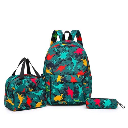 Morbuy Children's Backpack Cartoon Boys Girls School Bag Set Students Teenagers Elementary 3 in 1 Book Bag with Lunch Bag and Pencil Case, Lightweight Large Capacity Rucksack (Green Dinosaur)