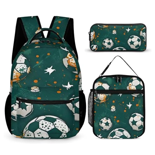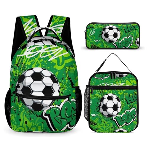 Mateju School Bag, Football Print Lightweight Backpack, 3 in 1 School Bags for Girls Boys, Kids Backpack with Lunch Box & Pencil Case for Sports Travel Holiday Teenagers Rucksack (Green 2,one Size)