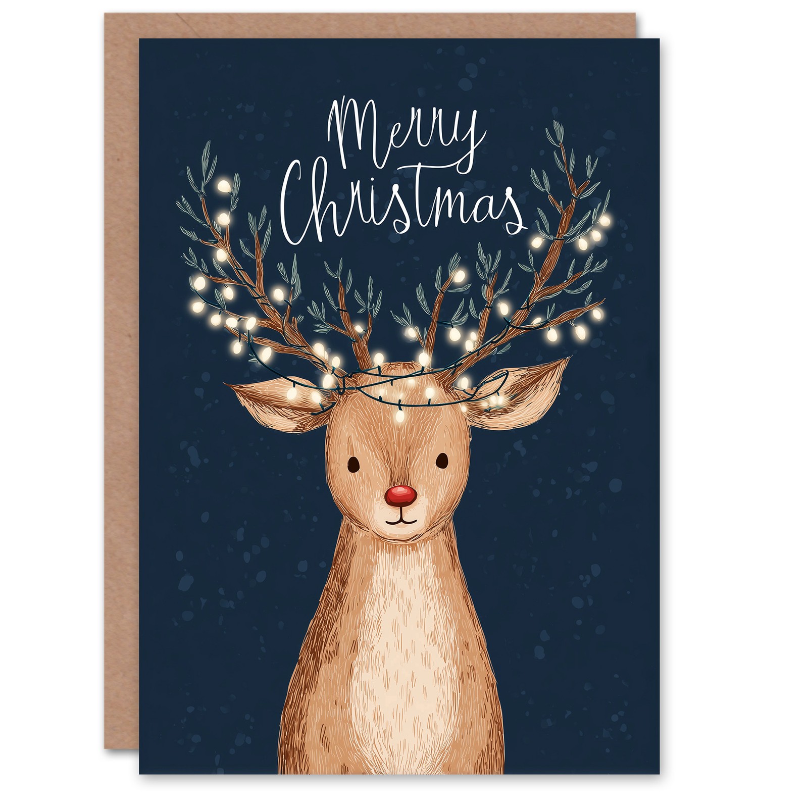Christmas Card Cute Rudolph Red Nosed Reindeer With Fairy Lights