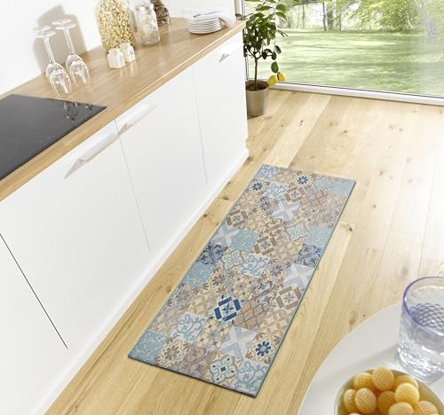 Hanse Home Kitchen Runner - Kitchen Rug Non-Slip and Washable - Easy Care Carpet Runner Tile Pattern Rug Runner for Kitchen, Hallway, Entryway, Dining Room - Blue Multi-Colour, 75 x 150 m
