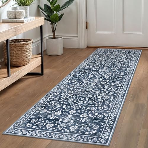 SILOLOOM Vintage 2x7 Runner Rug, Navy Washable Runners for hallways, Super Soft Kitchen Runner Rug Non Slip, Print Faux Wool Floral Thin Carpet Runner for Entryway Indoor Bedside Runner