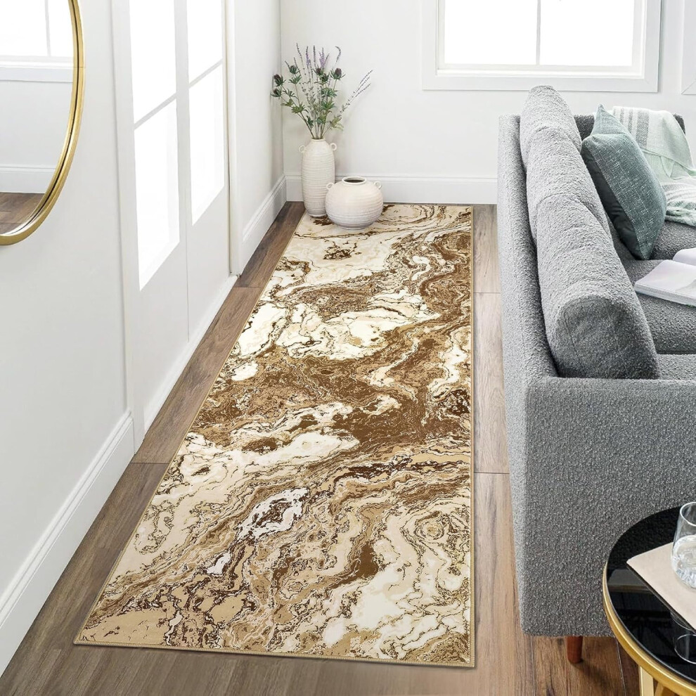 2'x8' Modern Marble Runner Rug, Washable Kitchen Runner Abstract Marble Pattern Rug Runners for Hallways Non Slip for Bedroom Entryway, Brown