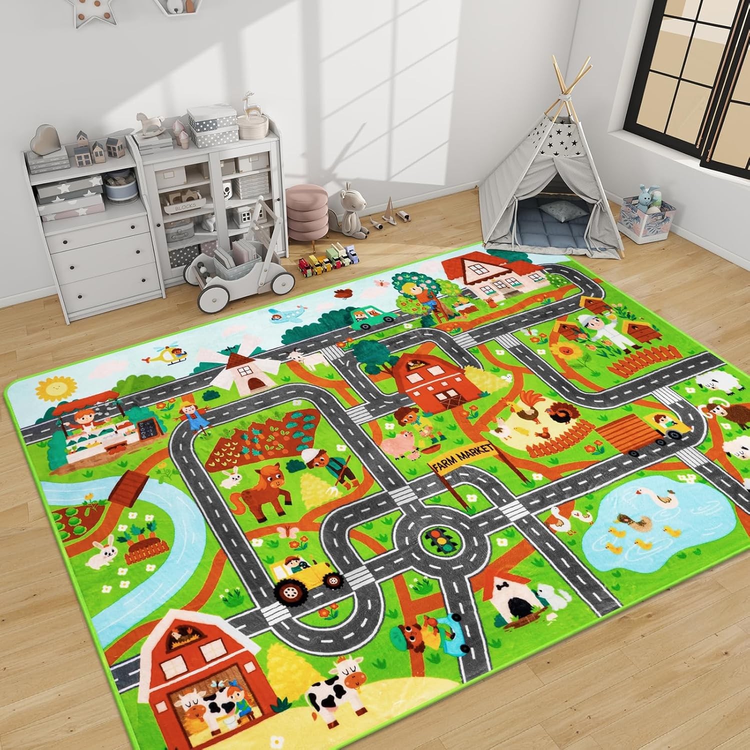 Kids Rug Play Mat for Toy Cars, 200×150 CM Farm Life Market Road Traffic for P