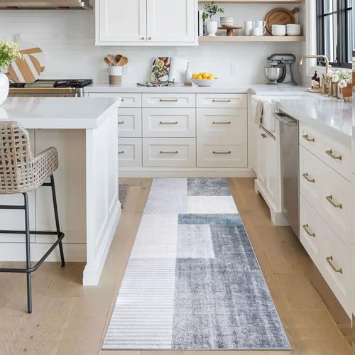 Beeiva Checkered Kitchen Runner Rug 2.5x10, Ultra Thin Washable Runners for Hallways Non Slip, Moroccan Trellis Print Non Shedding Kitchen Runner Rugs, Stain Resistant Blue/Grey Hallway Home Decor