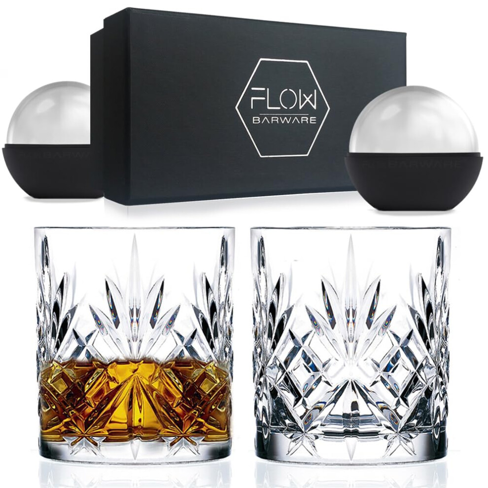 FLOW Barware Classic Whiskey Glasses Set of 2 | Whisky Glasses Gift Set with Ice Ball Moulds | Heavy Tumbler Whiskey Glass for Rum, Scotch, Bourbon Gin & Tonic & Negroni Cocktails