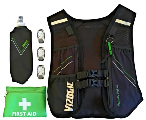 Running Vest with Phone holder & LED Lights-Reflective Running Vest For Men & Women-Lightweight Hydration Vest With 500ml Water Bottle, Safety Whistle & First Aid Kit-For Night Running & Dog Walking