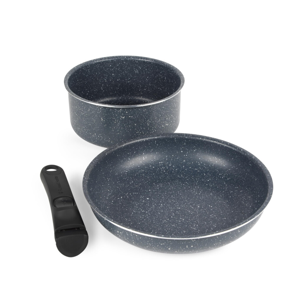 Russell Hobbs Smart Clip 3-Piece Pan Set – Xylan Plus Non-Stick Coating, Nightfall Stone Starter Set, 24 cm Frying Pan & 18 cm Saucepan, Removable Clip-On Handle, Stackable Design, PFOA-Free
