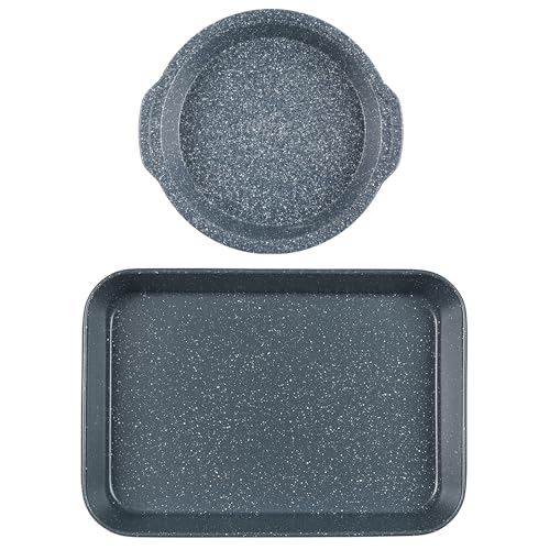 Russell Hobbs COMBO-7557A Roasting Pan & Cake Tin Set, Non-Stick Carbon Steel Oven Trays, Tall Deep Sides, PFOA-Free, Easy Clean, Cooking Set, Nightfall Stone Collection, Blue Marble, 26/40 cm