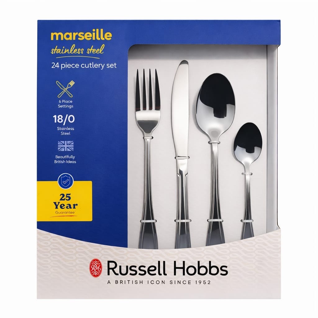 Russell Hobbs RH02224EU Marseille 24 Piece Cutlery Set - 18/0 Stainless Steel Tableware for 6 Place Settings, 25 Year Guarantee, Includes Knives, Forks, Tablespoons, Teaspoons, Mirror Polish Finish