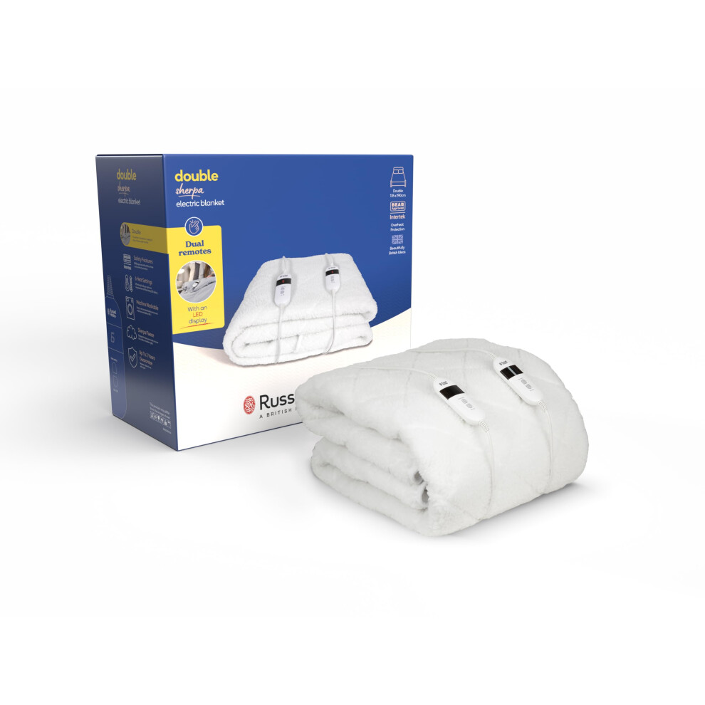 Russell Hobbs Electric Blanket, Sherpa Fleece Heated Double Fitted Underblanket, 6 Heat Settings & 10 Hour Auto Shut Off, Energy Efficient, Machine Washable, 2x Remote, 135 x 190 cm, 120W, RHBDB8004