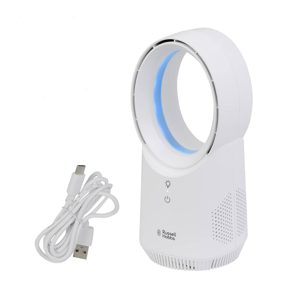 Russell Hobbs, Compact Wireless Desk Fan, USB Rechargeable, 3 Speed Settings, Bladeless Design, Ambient Lighting in White, RHBLDLUSB25