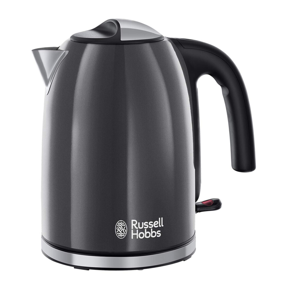 Russell Hobbs Grey Stainless Steel 1.7L Cordless Electric Kettle with black handle (Fast Boil 3KW, Removable washable anti-scale filter, Pull to open