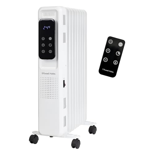 Russell Hobbs 2000W/2KW Oil Filled Radiator Digital 9 Fin Portable Electric Heater in White, Remote Control 3 Heat Settings, 24hr Auto Timer, Overheat Protection, 2 Year Guarantee RHOFR2009-D
