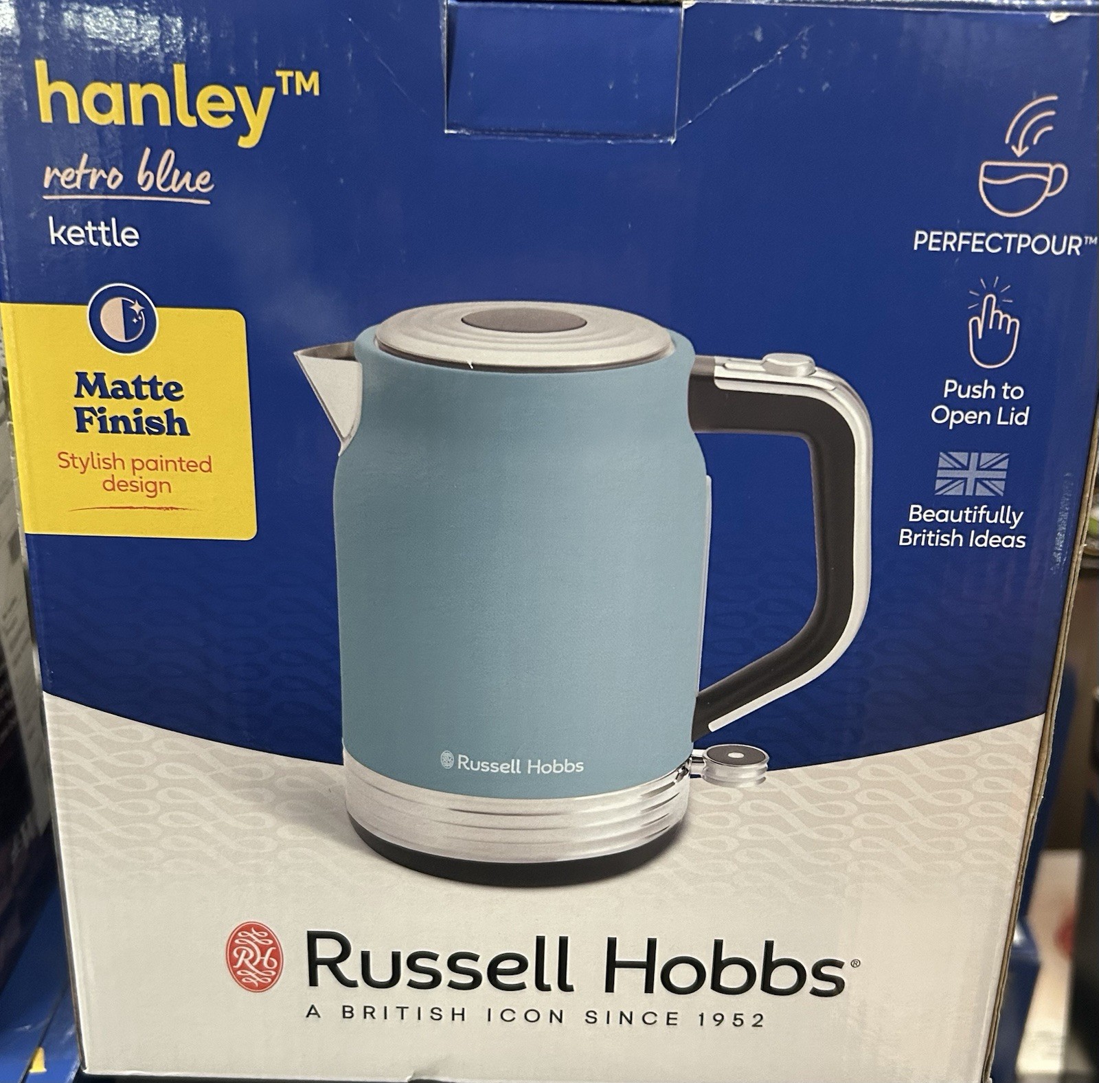 Russell Hobbs kettle [1.7l, 3000W, stainless steel] distinctions ocean blue(Push-to-open lid, 360° base with cord storage, Perfect pour spout,removable Anti-scale filter, water level indicator) 24282
