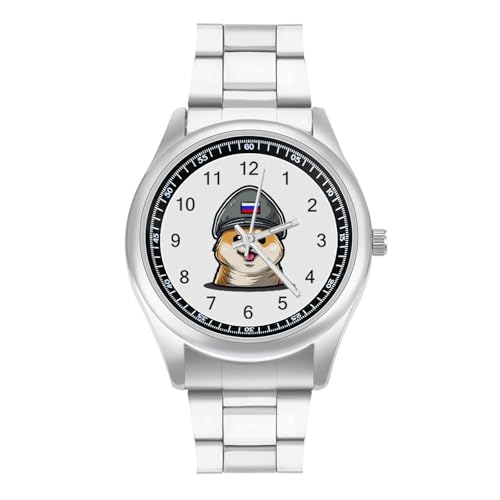 Corgi Dog in Military Russian Flag Hat Fashion Men's Watch Business Dress Analog Quartz Stainless Steel Wrist Watches
