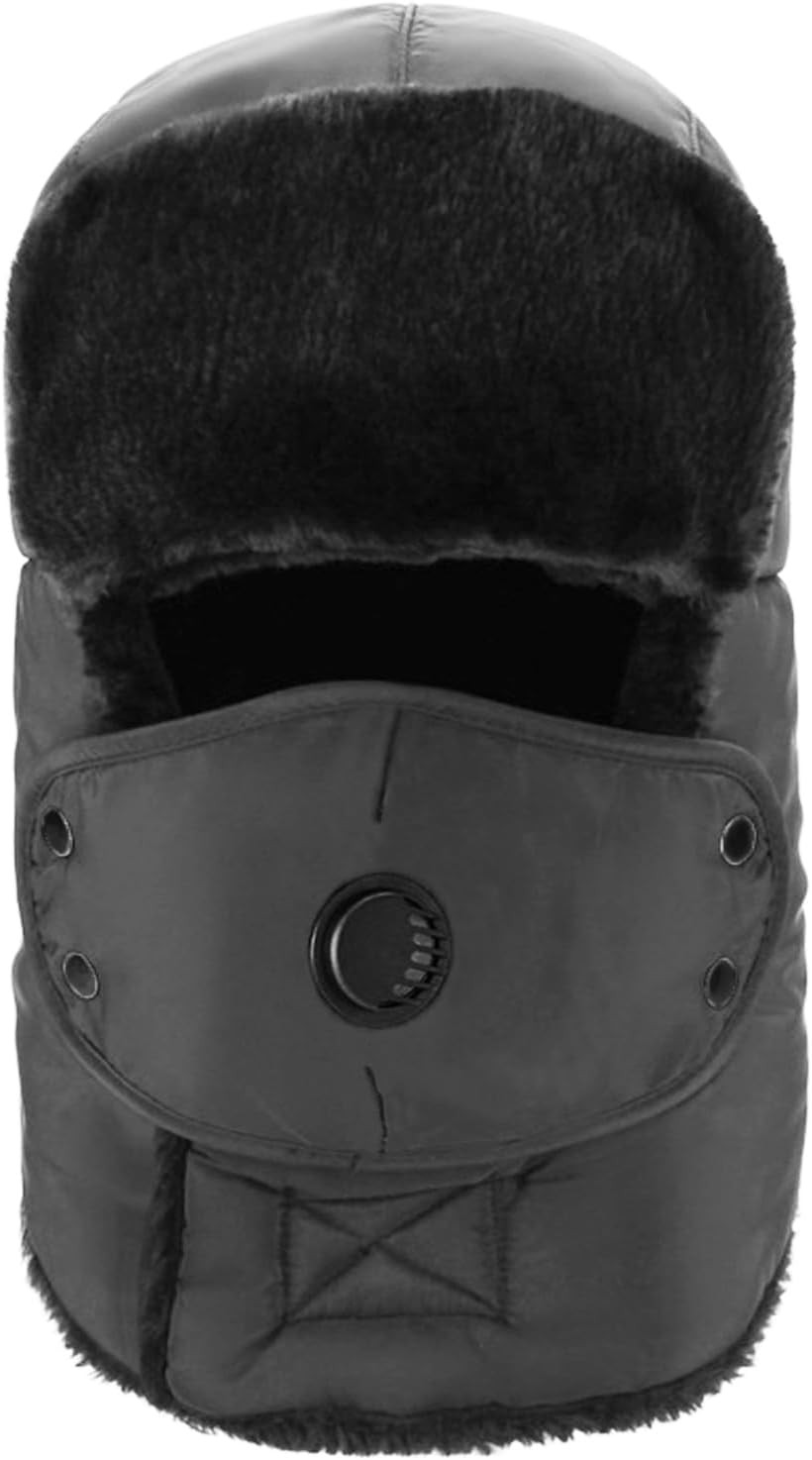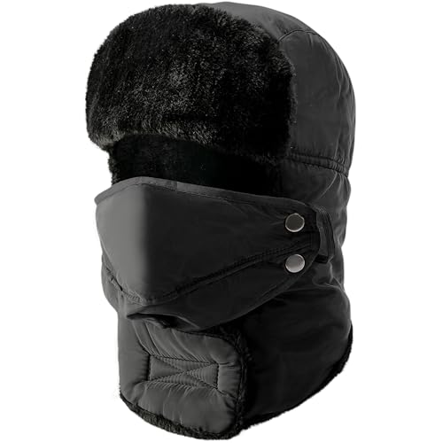 Winter Hat with Ear Flaps - Fur Trapper Hat with Mask - Bomber Hat Windproof,Waterproof - Russian Hat for Men & Women,Aviator Warm Snow Ski Hunting Trapper Trooper Black