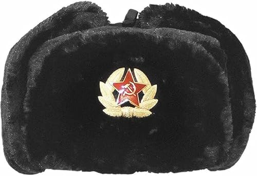 Mens Russian Winter Hat | Faux Fur Ushanka Cossack Hat with Ear Flaps & Decorative Military Pin | Soviet Style Trapper Ski Hat Perfect for Long, Cold Winter Nights One Size-58/60cm (58 cm Black)