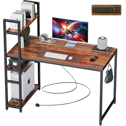 ADOV Computer Desk with Storage Shelves, 120x46cm Rustic Desk with 4-Shelves and Power Outlet, Vintage Industrial Desk, Study Table with Adjustable Bookshelf and Hook for Home Office Study Room