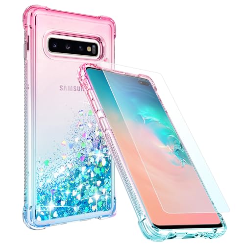 Pilaru for Samsung Galaxy S10 Plus Case [with Screen Protector] Clear Liquid Heart Glitter Soft TPU Cover Transparent Girly Protective Holographic Gel Phone Case for Galaxy S10 Plus,Pink/Teal
