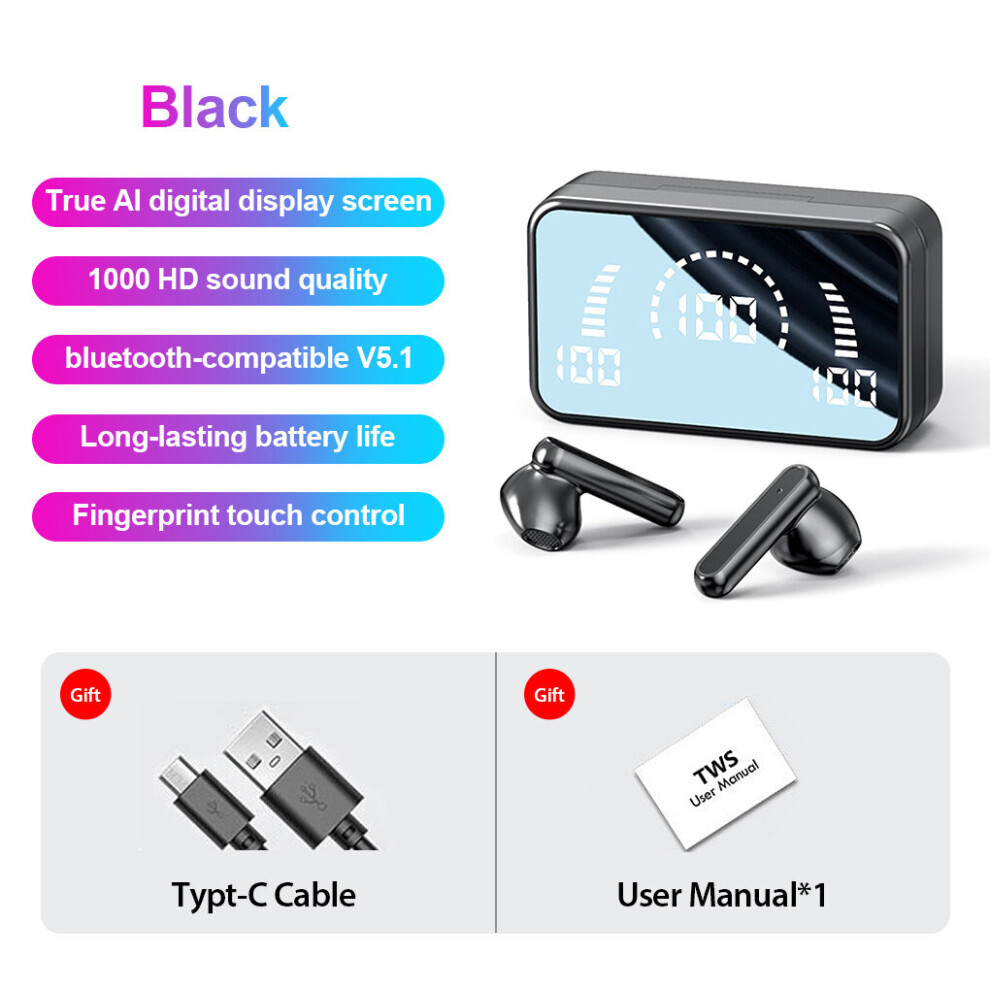 (a-Black) S20 Mirror Earphone Bluetooth-compatible Wireless Headphones With Mic Touch LED Stereo Audio Earbuds Headphone Sport Waterproof