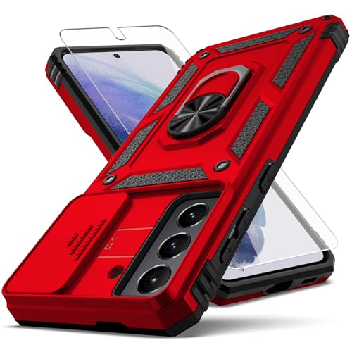 YZOK for Samsung Galaxy S21 Case,with Camera Lens Cover HD Screen Protector,[Military Grade] Ring Car Mount Kickstand Hybrid Hard PC Soft TPU Shockproof Protective Case for Galaxy S21, Red