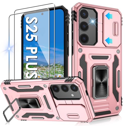 Jshru for Samsung Galaxy S25 Plus Case with Screen Protector | Camera Protective Cover | Ring Stand, S25 Plus Phone Case for Men and Women | Shockproof Bumper Phone Cover, Rose Gold